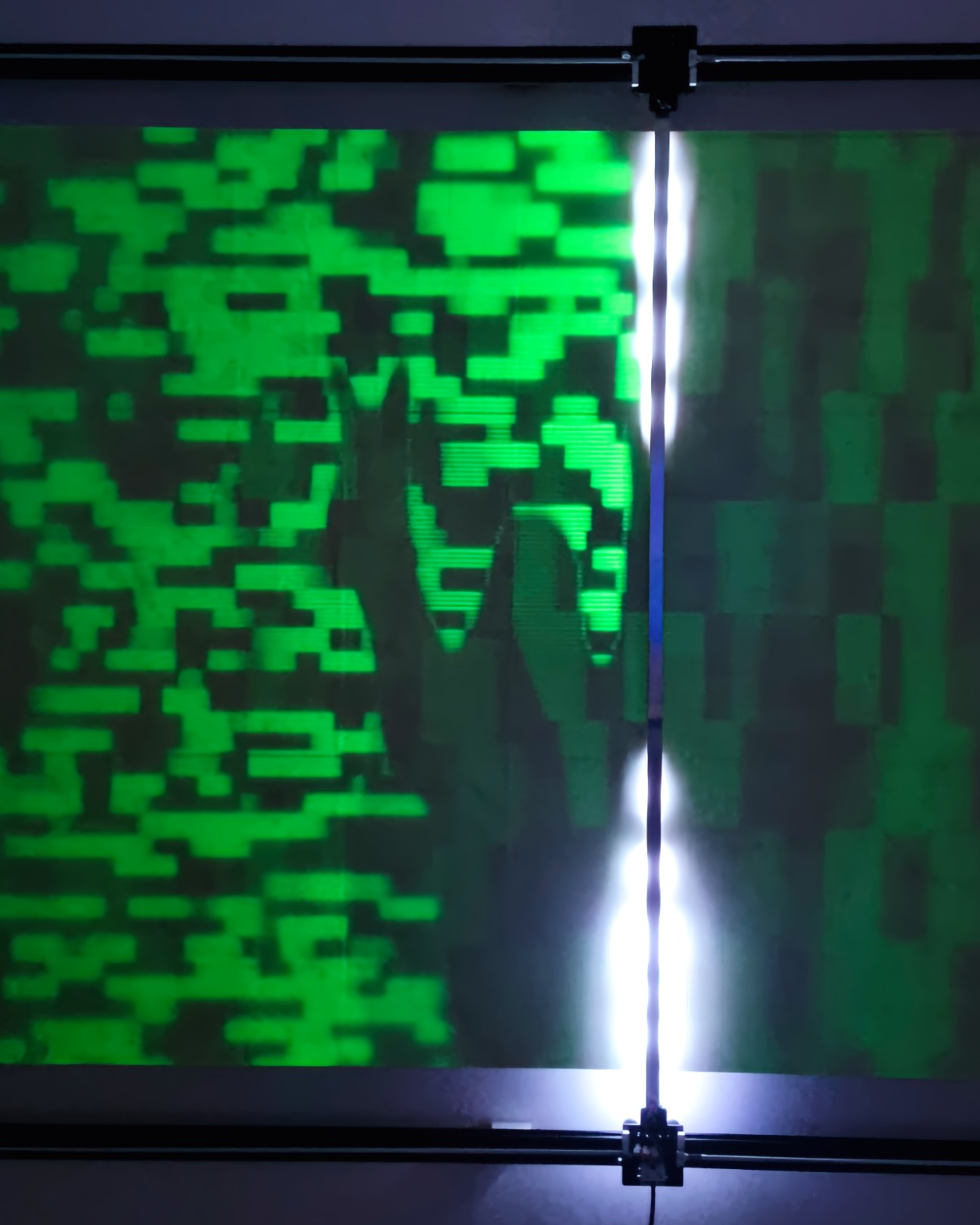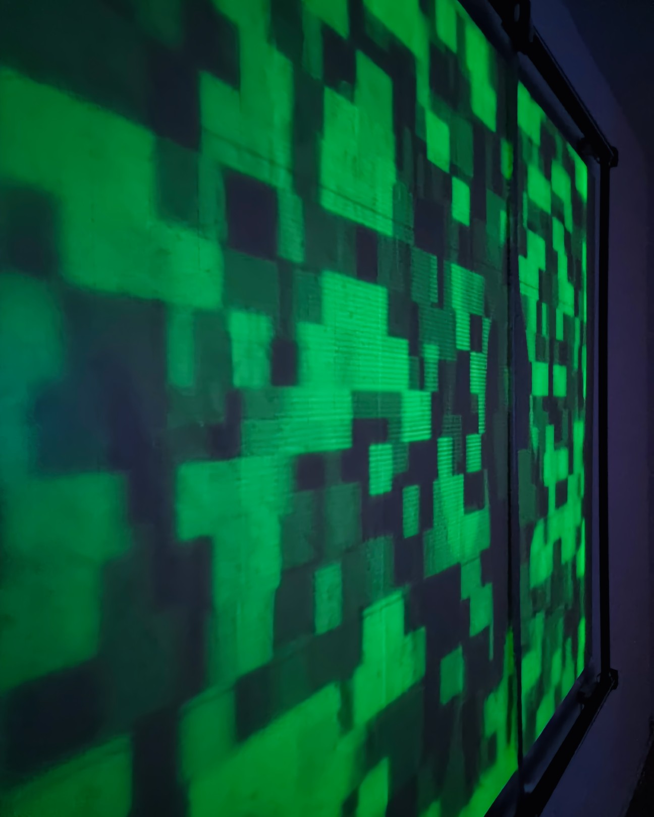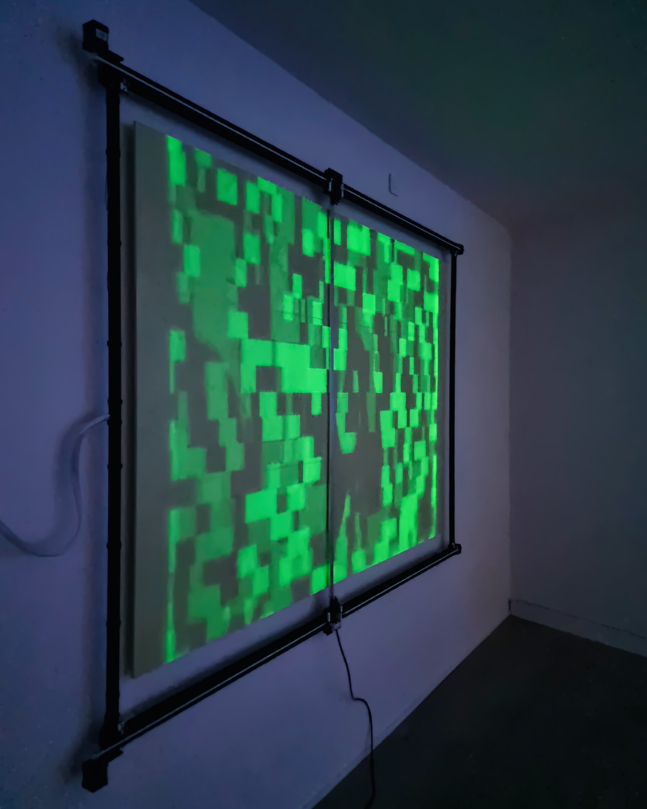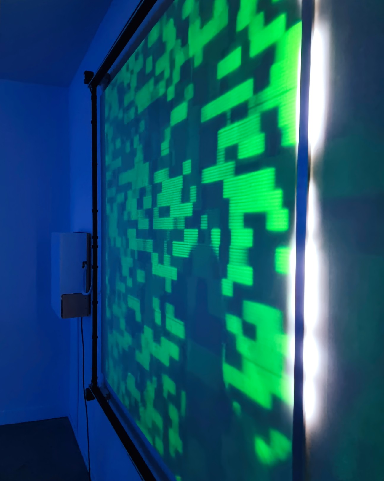 TRACES is an installation exploring light and ephemeral phosphorescence, a pixel-by-pixel display that fades and reappears over time, like a cryptic, encoded litany recited silently. TRACES offers a reflection on the transient nature of all things and our relationship to memory, questioning the digital footprints we leave behind, consciously or unconsciously, and their use without our knowledge by opaque algorithms.