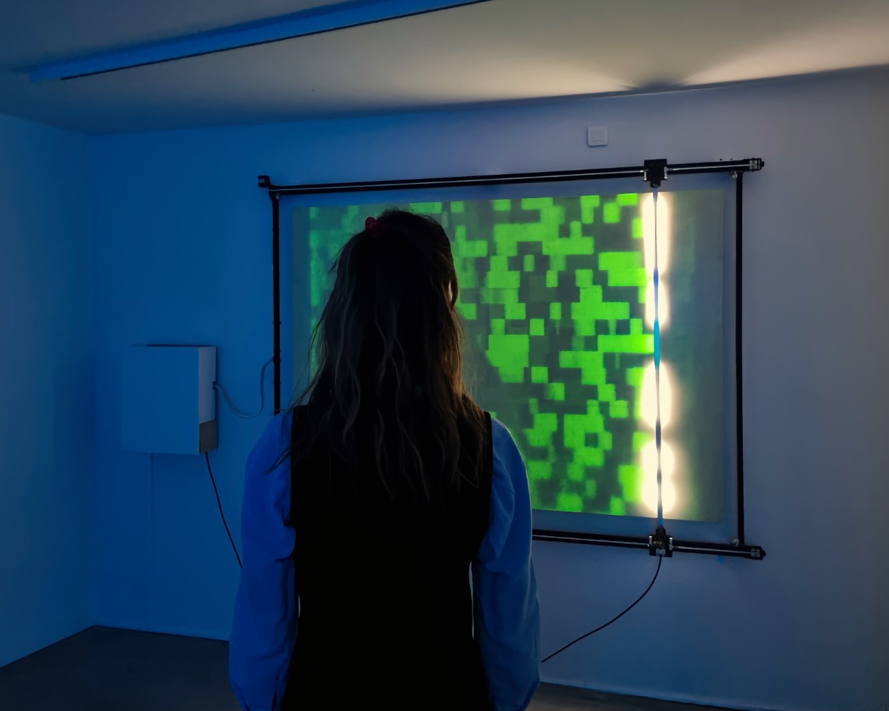 These digital footprints, captured without the visitors’ conscent by sensors from other installations within the PRESENCE exhibition, are revealed as silhouettes superimposed on these encoded data. Diffuse human forms relentlessly remind us of the lack of control that characterizes our digital identities and the intrusive nature of the processing of our personal data.